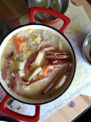 洋蔥,紅蘿蔔,馬鈴薯用奶油炒一炒,加水加一包蔬果多穀飲,加飯,玉米,起司,肉。